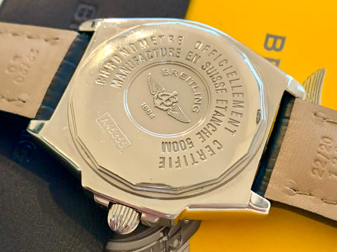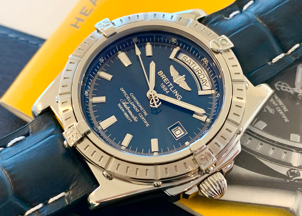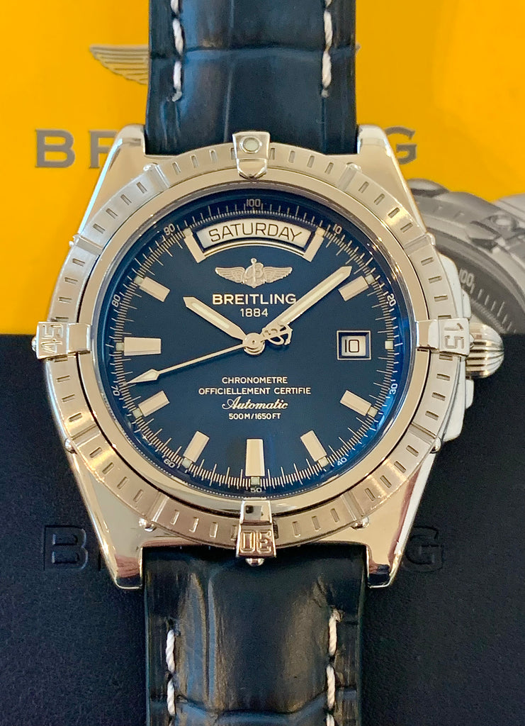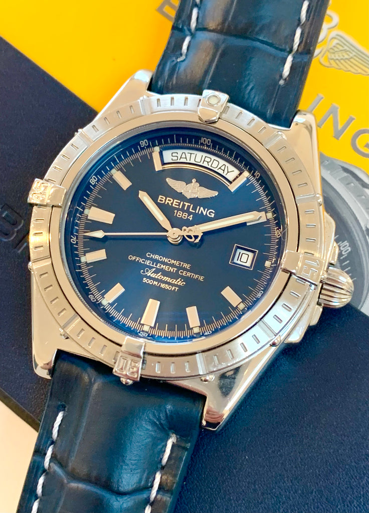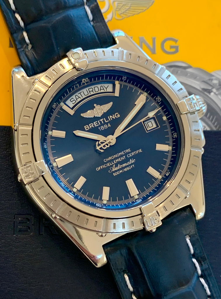 Dial: Near mint factory printed original dial in deep blue with day aperture at 12 o'clock and date at 3.  Signed Breitling 1884, Chronometre Officially Certified, Automatic, 500m/1650ft.