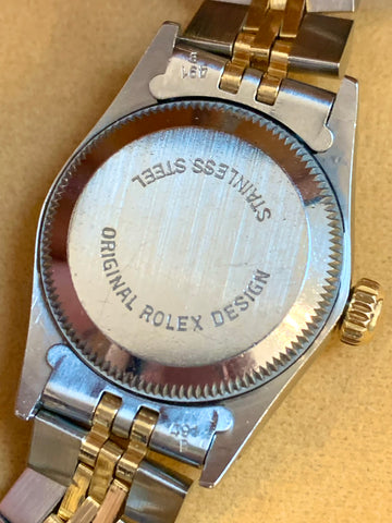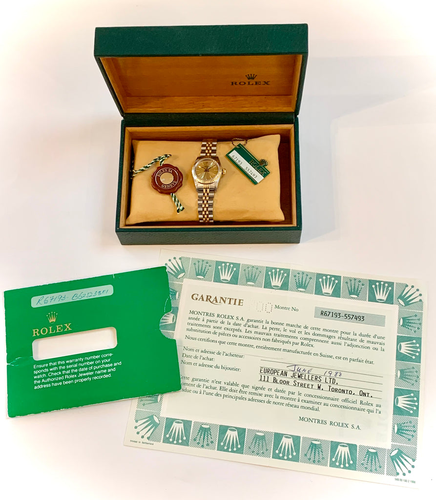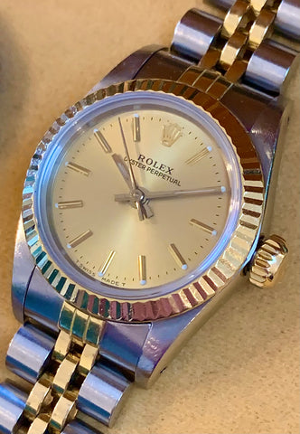 Case: Solid stainless steel case with 18k yellow gold fluted bezel, measuring 25mm in diameter excluding the signed Rolex screw-down crown. The dial is protected by a flawless sapphire crystal and the case is fully signed between the lugs with the model number 67193 and serial number in the R range dating its manufacture to approximately 1987 (although originally sold in June of 1988). The original Rolex 62523D-18 (I8k) Jubilee bracelet is in excellent lightly used condition showing only minor stretch from light use and will fit up to a 6-1/4 inch wrist at its current length. Extra links are available to purchase if required.