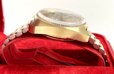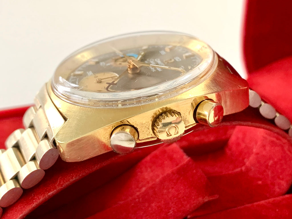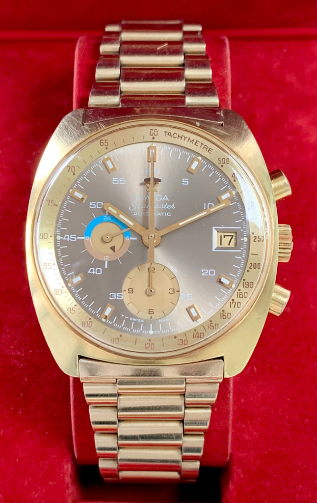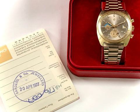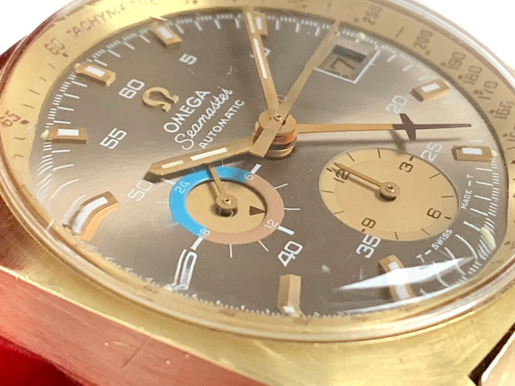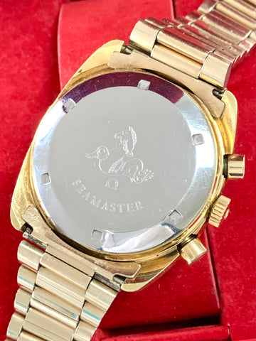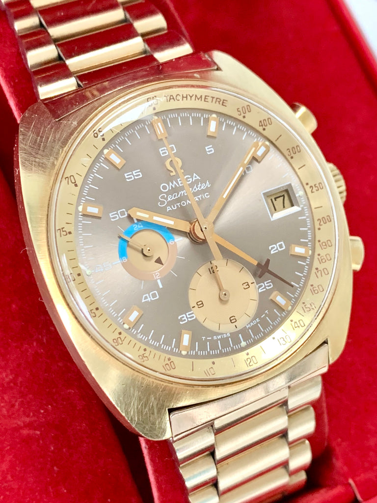 A beautiful early 1970's Omega Seamaster Automatic chronograph complete with original box and all paperwork, freshly serviced and in excellent working condition, ready to wear! These 70's chrono's have such a unique and bold style, I just love the colour combination Omega used here. That original factory printed taupe colour dial with blue and gold details is just stunning, housed in a sharp gold-plated case with original full length bracelet. Powered by the high-grade, robust Omega caliber 1040 (Lemania 1340) it has the unique features of a centrally mounted minute counter with "mystery" 24 hour indicator at 9 o'clock just under the small constant seconds hand. Rare to find with its complete sales set, this example is in very collectable condition, but has just enough wear, consistent with age that one could wear it without worrying about it too much. Such an unusual and eye-catching 1970's timepiece form the famous house of Omega!!