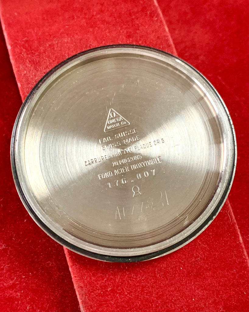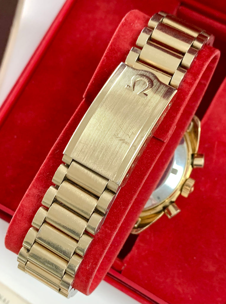 Case: Heavily gold plated case measuring 38.5mm in diameter excluding the original signed crown, with pump-style pushers and stainless steel back. Fitted on its original Omega gold plated model 1182 bracelet that will fit up to a 6-3/4 to 7 inch wrist, also in excellent lightly used condition. Signed inside the back Omega Watch Co, Fab Suisse, Carrure Lunette Plaque Or G, 20 Microns, Fond Acier Inoxydable, with model number 176.007.