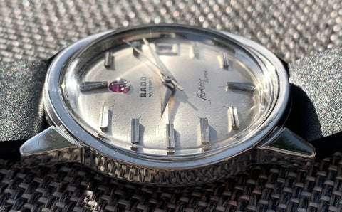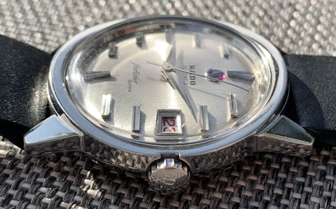 Probably the coolest designed, most beautifully executed Rado I have ever seen and of equal if not superior quality to Omega Seamasters of the same era, this Starliner Super has a wonderfully unique and stylized look manufactured in solid stainless steel with fantastic original dial and high grade 30 jewel movement. I love the look of the top to bottom convex shape bezel with customs signed, slightly inset crown and large logo back!! This watch exudes quality in every regard and has such a fantatic vintage look. The original factory printed no-lume dial is truly awesome with those horizontal markers and red date display with matching dauphine hands. It has just been freshly serivced here at Meticulous and is keeping excellent time ready to wear. A very hard model to find and one of coolest designs in Rado history.