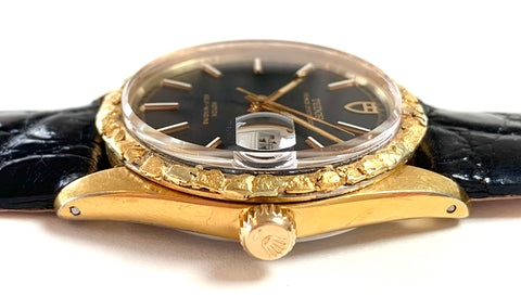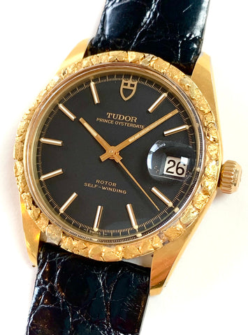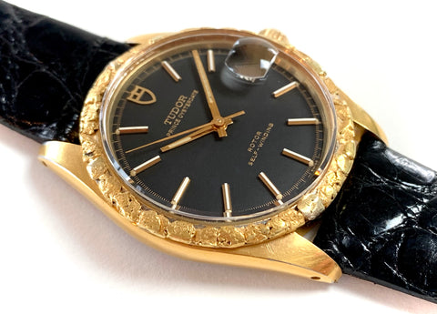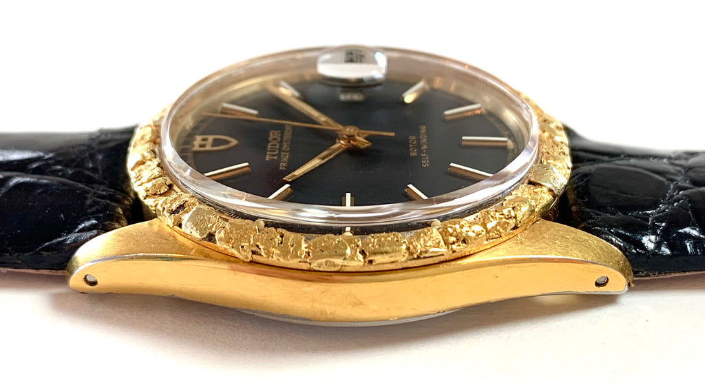 A truly unique and beautiful "Yukon Gold Nugget" Tudor Prince Oysterdate automatic, featuring a gorgeous factory printed matte black dial with gilt printing, all in superb overall condition, freshly serviced and keeping excellent time, ready to wear! A beautiful timepiece on the wrist, the black dial gives a sharp, contrasted look on the wrist surrounded with the naturally formed, solid gold nuggets soldered on the bezel. At first this appears like an aftermarket addition, but when I searched for information on this model 9050/1, another very similar example came up within the same 1000 serial numbers (729XXX) with a very similar gold nugget bezel, both located in western Canada. Was this a limited run sold only in Canada? It is tough to tell without official Tudor records, but never-the-less, a very rare and unique Tudor wristwatch from the late 1960's fitted with a beautiful brand new 19mm genuine Crocodile strap, ready for its next adventure.