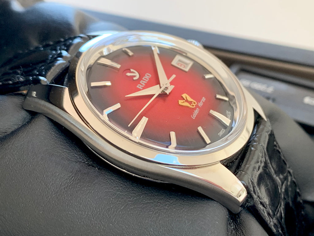 Dial: Gorgeous factor printed original dial with black outer edge fading to a bright red centre with applied baton hour markers and date display at 3 o'clock.  Signed Rado, Golden Horse, Swiss Made with sharp dauphine hands to match.  Mint condition.