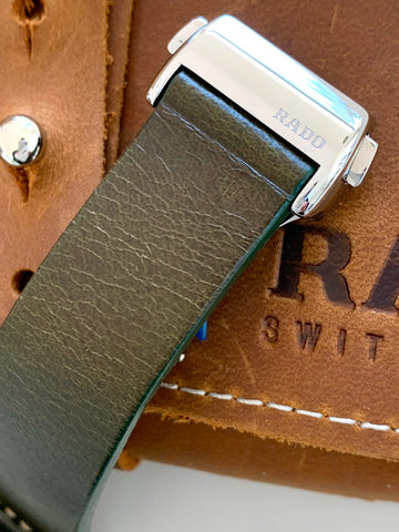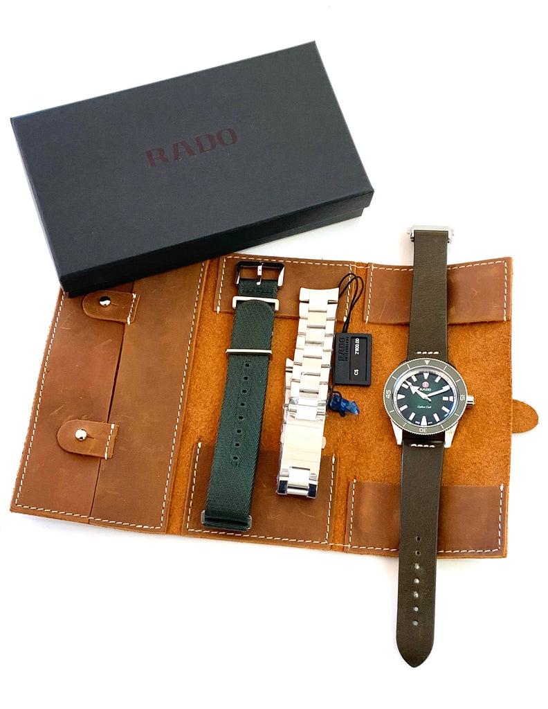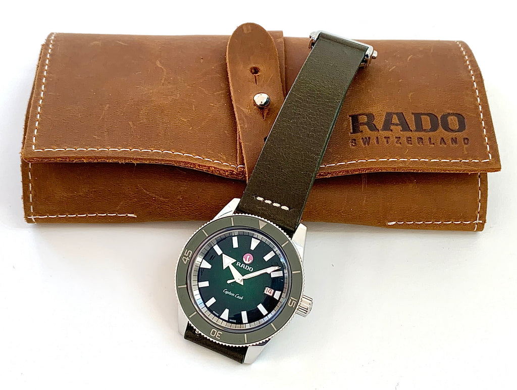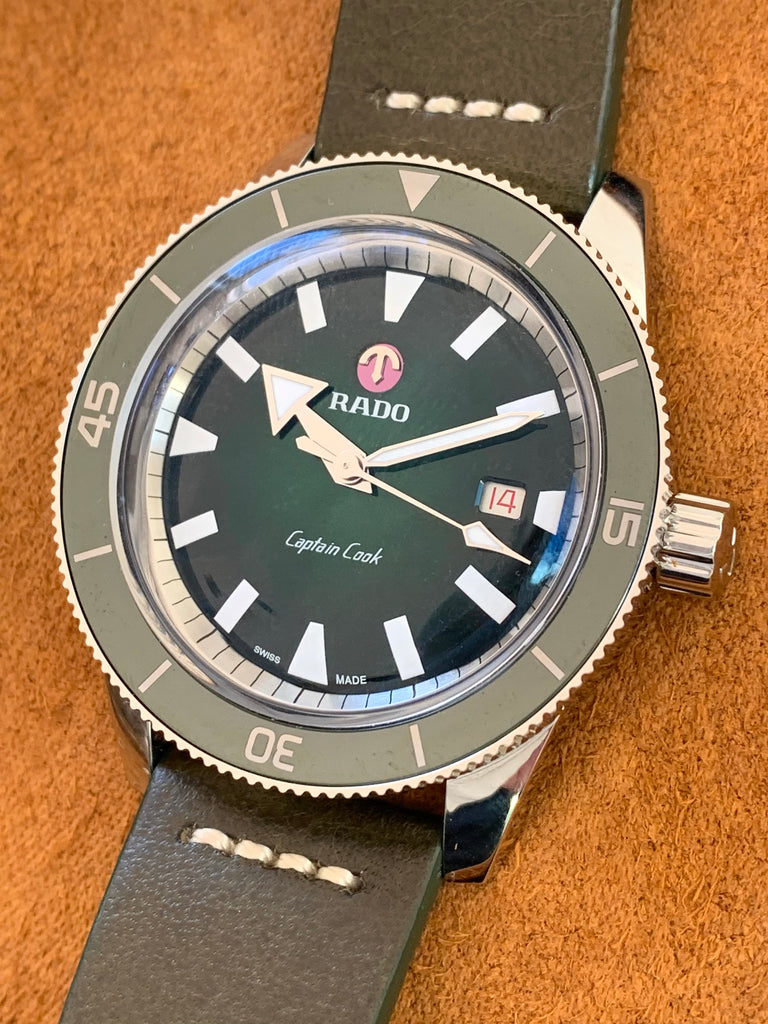 Such a beautiful vintage-inspired wristwatch by Rado, this green Captain Cook is in near mint, unworn condition complete with all of its original boxes and paperwork as well as 3 straps; a leather on deployant buckle, a steel bracelet and a matching green NATO.  At 42mm in diameter this solid stainless steel timepiece has a wonderful presence on the wrist with a lovely green glow with rotating bezel and vintage styling giving it such great character.  I just love that you have 3 straps to choose from, each giving it a very different look and feel on the wrist.  A wonderful modern timepiece by Rado with an appreciative nod to one of their most famous vintage models from the 1960's.