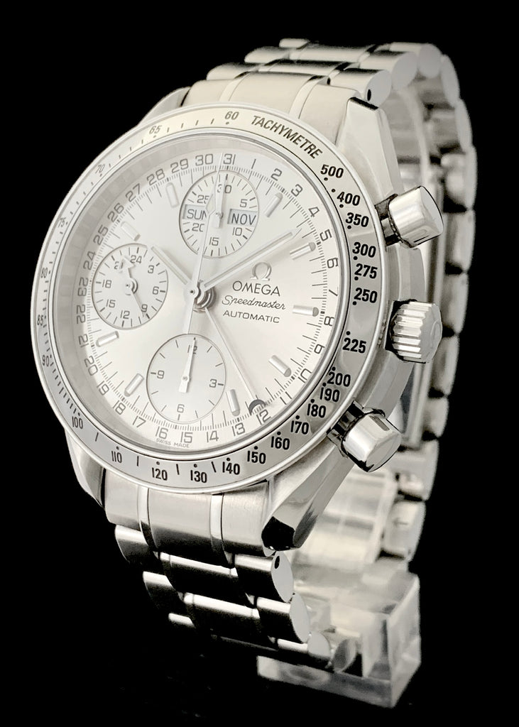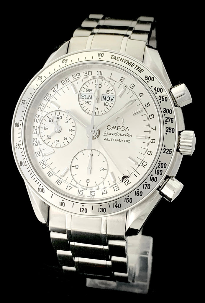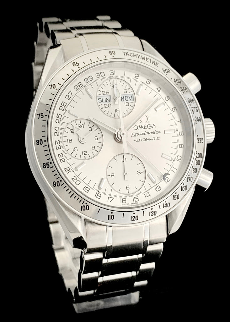 A gorgeous near mint, factory finish Omega Speedmaster triple-calendar day-date automatic chronograph showing very little signs of wear, powered by freshly serviced Omega calibre 1151 modified Valjoux 7750 movement, running beautifully, keeping excellent time with all of its complications working perfectly. This famous Omega timepiece shows you all you need to know on your wrist, the day, date and month with 24 hours indicator, constant seconds and the ability to time events with a minute and hour recording chronograph. It is also sharp on the wrist with its clean silver dial and steel bezel with black lettered Tachymeter track. At 39mm in diameter it fits beautifully on any wrist and is comfortable to wear on its original Omega 1562/850 bracelet. Testing fully water resistant at time of service. A complex, high-grade Omega Speedmaster model in superb all original condition, ready to wear!