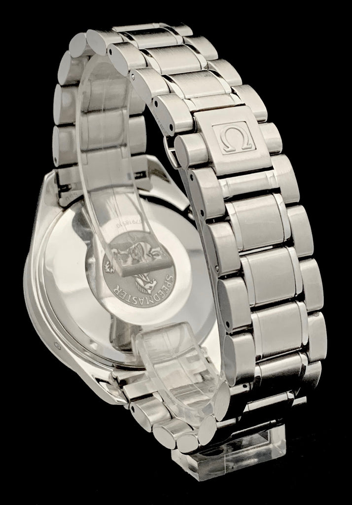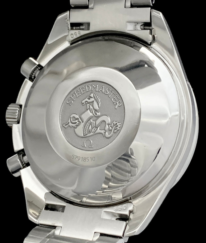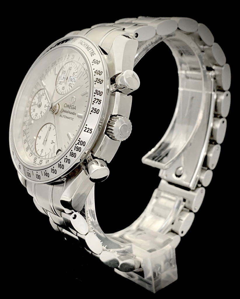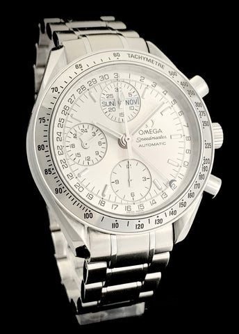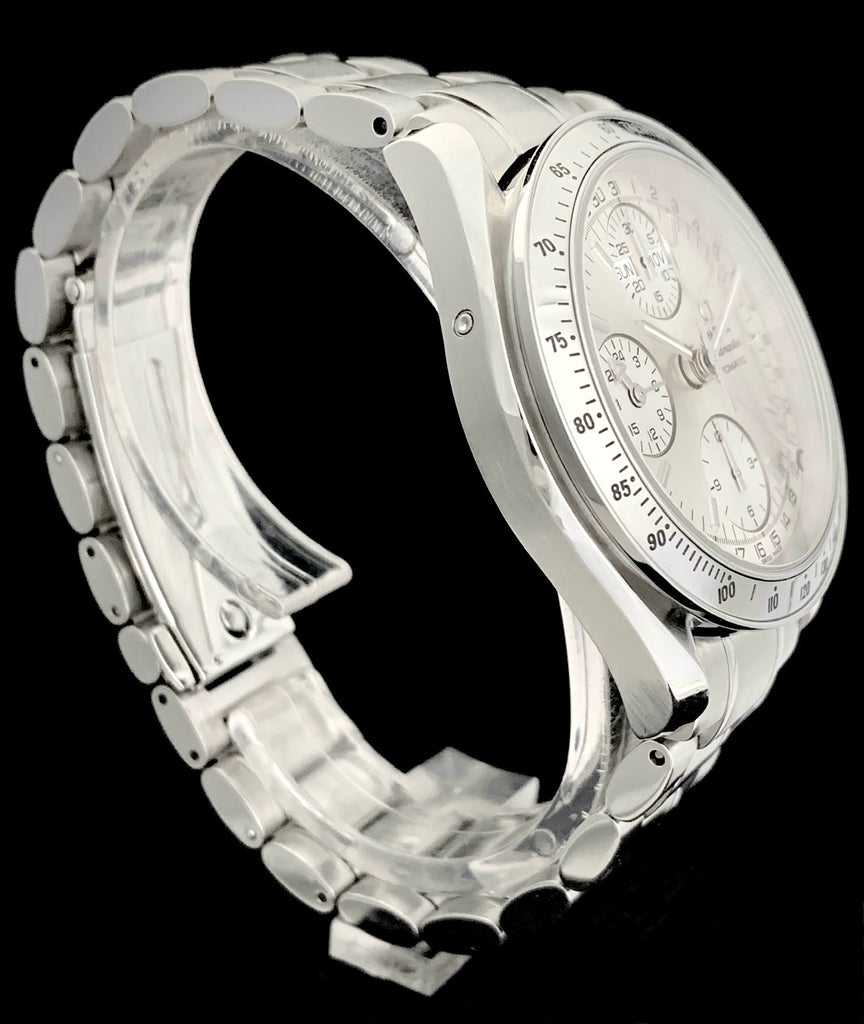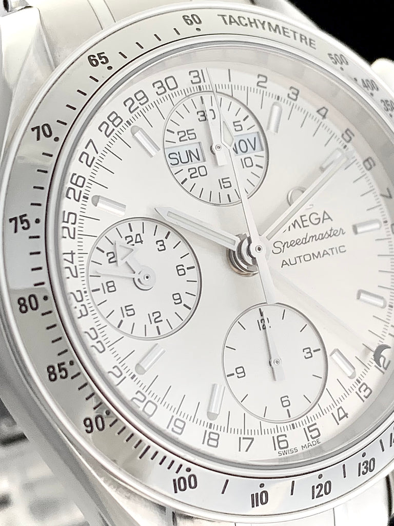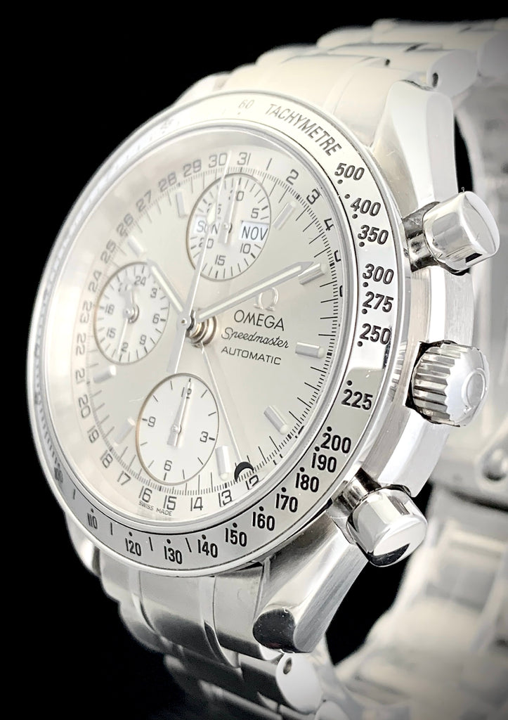 Dial: Stunning and complex near mint factory printed original dial with day and month apertures at 12 o'clock, hour and minute sub registers at 12 and 6 with 24-hour indicator and constant seconds at 9 o'clock. Silver background with off white matte texture sub-dials. Fully signed Omega Speedmaster Automatic, Swiss Made. The matching hand set is also near mint with matching luminous.