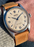 Case:  Solid stainless steel case measuring 36mm in diameter excluding the original signed Rolex Brevet Plus crown which screws down nicely to the case.  Stamped between the lugs at 12 o'clock Brevet + 6298, then at 6 o'clock with the serial number 930XXX (1953) Modele Depose, both sides partially rubbed away from bracelet rubbing at some point.  The case has some light pitting between the lugs as well as overall surface wear from years of use but with no major imperfections, most likely polished at some point in its history.  Inside the case back is fully signed Geneva, Swiss, Montres Rolex SA, 6298, IV 53 (4th quarter of 1953), 18.  Comes on a beautifully matched, brand new light brown nubuck leather 20mm strap with generic stainless steel buckle.