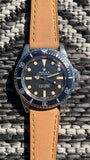 A gorgeous vintage 1966 Rolex Oyster Perpetual Submariner model 5513 in solid stainless steel featuring its original lightly aged deep grey, fat font bezel insert surrounding a beautifully refinished matte black dial which looks gorgeous on the wrist with its cream colour lume markers matching the original hands to perfection. It has that perfect vintage feel on the wrist fitted with a nicely matched light tan leather strap making it very comfortable to wear. The famous calibre 1520 automatic movement within is in excellent cosmetic and mechanical condition having just been freshly serviced here at Meticulous. Superb working condition, keeping great time with our full 1-year mechanical warranty. If your looking for a 1960's Submariner with that perfect vintage look at a great price, this is the watch for you.