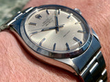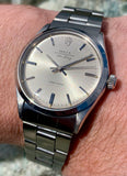 A stunning all original Rolex Air-King in solid stainless steel with original folded link bracelet, freshly serviced here at Meticulous and ready to wear! Such a simple, timeless design, this model 5500 is as stylish today on the wrist as it was over 50 years ago when it was first sold. I just love the unique Air King style hand and cream colour matching luminous on the dial. Such a classy watch! It comes on its original folded link 7835-19 bracelet with 357 endlinks. Tested fully waterproof at the time of service, this is a fantastic daily driver, suitable for dress or casual wear. Built to last a lifetime without ever going out of style.