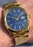 A gorgeous vintage Rolex Oyster Perpetual Date model 1550 with rare blue textured dial housed in a 34mm case with a thick, solid yellow gold cap over a stainless steel body, freshly serviced here at Meticulous and keeping excellent time!