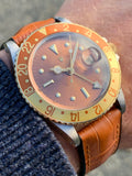 A gorgeous vintage 1972 Rolex Oyster Perpetual GMT-Master model 1675 in solid 18k gold and steel in superb, Rolex factory refurbished condition, ready to wear! This classic "Root Beer" model has that famous nipple dial look with a factory Rolex service dial, hands and bezel insert installed, with perfectly brushed lug-tops and flat polished sides with a brand new plastic crystal installed, looking near as sharp as the day it was sold over 50 years ago. This watch comes with its original box, GMT-Master booklet, hang tag and extra leather strap. A stunning vintage Rolex sport model with bold and clean vintage look on the wrist.
