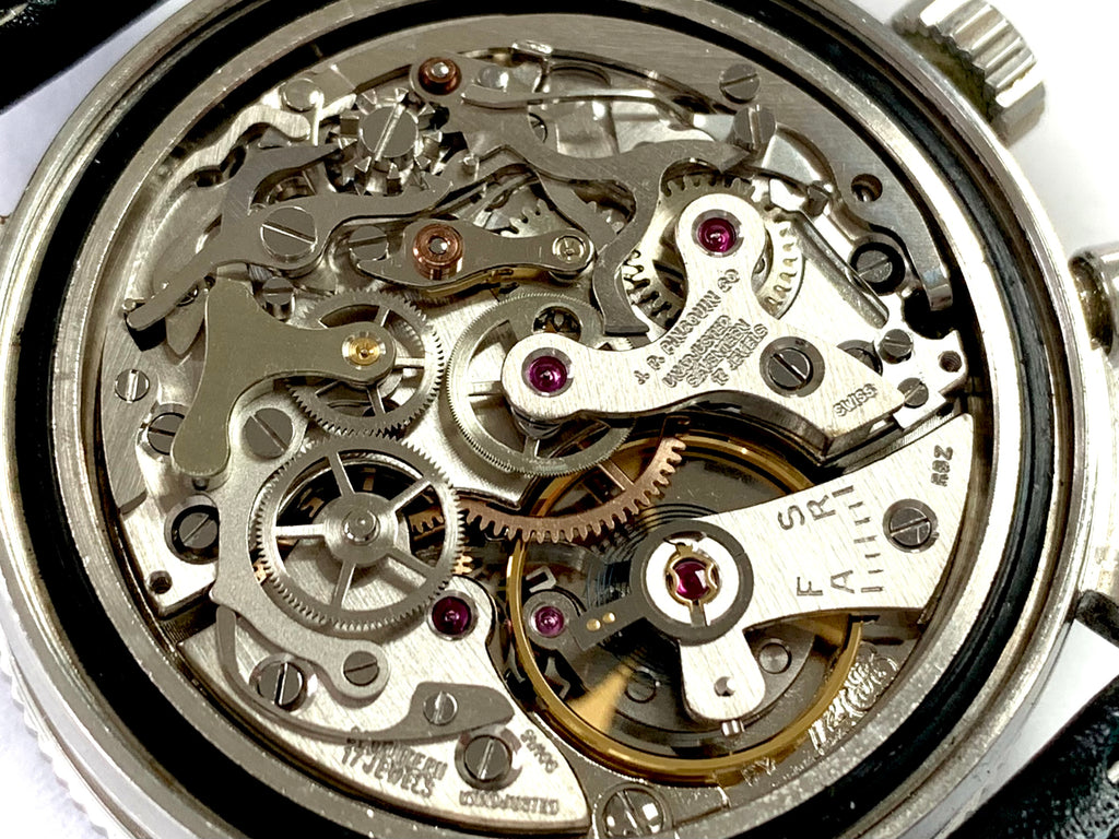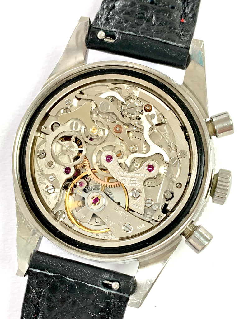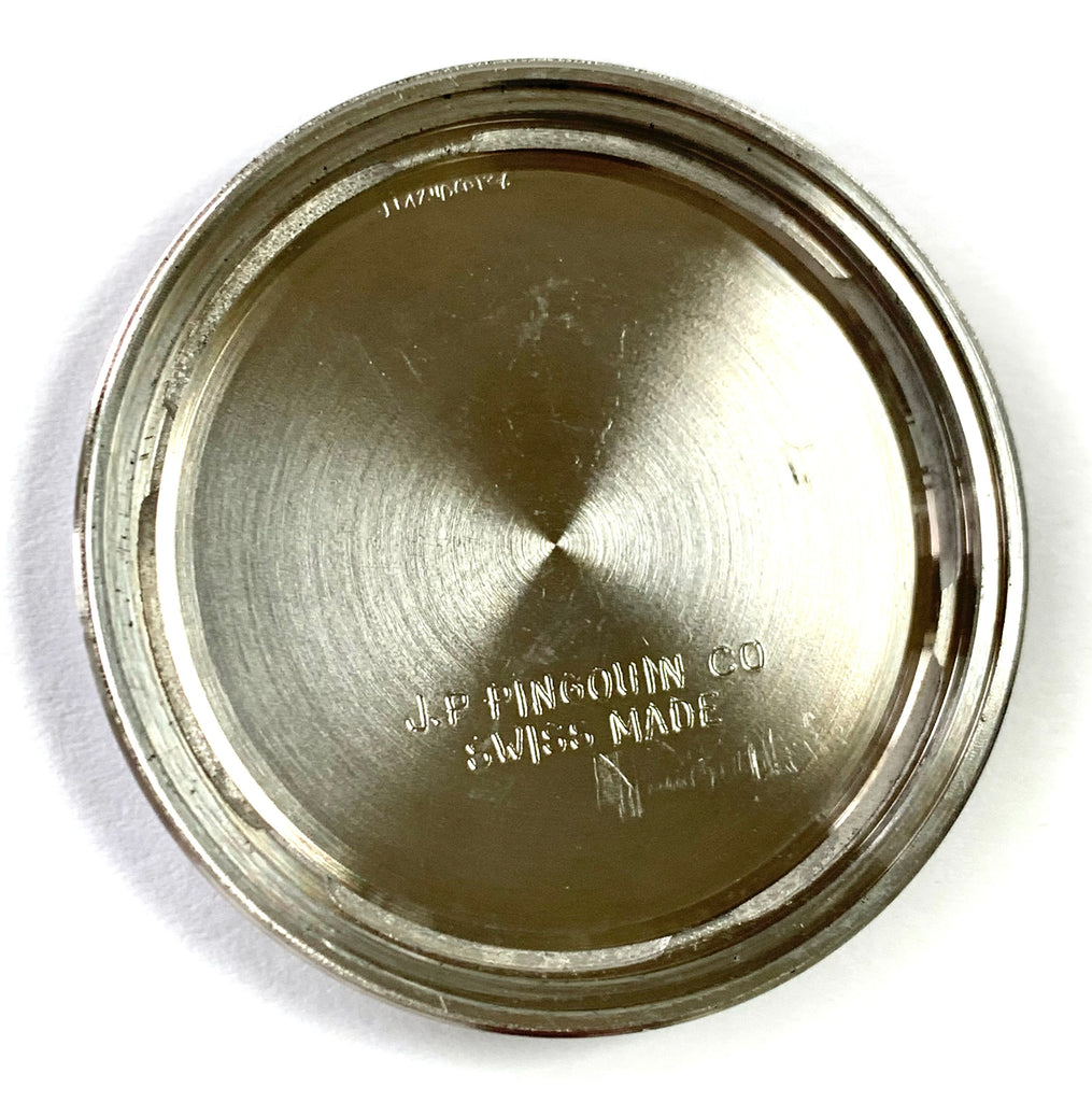 Movement: Beautifully preserved, near perfect original Valjoux caliber 72 (stamped below the balance 72 R) manually wound movement with incabloc protection on the balance, correctly signed J.P. Pingouin Co, Unadjusted, 17 Jewels, Swiss.  Incredible cosmetic and mechanical condition throughout freshly serviced and keeping excellent time with all chronograph functions working as they should.