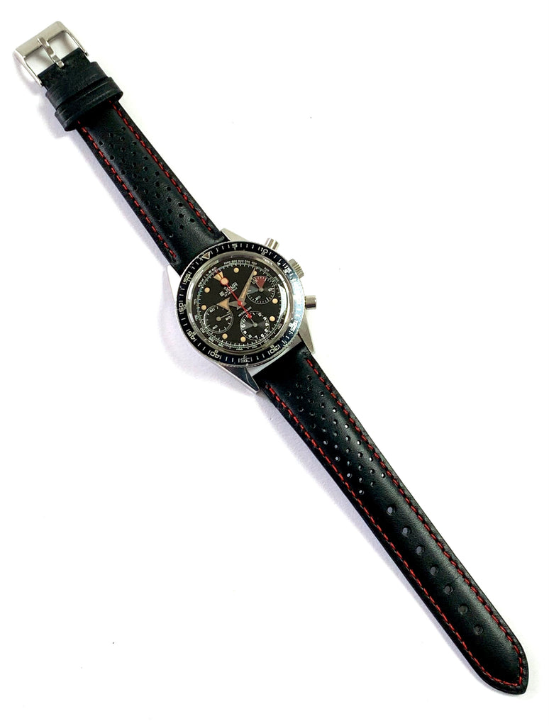 Case: Solid stainless steel case with bi-directional rotating bezel measuring 39mm in diameter excluding the original crown and pump-style pushers. The 19mm lug spacing is fitted with a perfectly matched black racing style strap with red accent stitching.  The back is fully signed All Stainless Steel, Waterproof, Tested to 20 Atmospheres, Incabloc, Swiss Made, Antimagnetic.  Inside we find the importers stamp, J.P. Pingouin Co, Swiss Made.  Excellent lightly worn condition with light surface marks throughout.  Unpolished.
