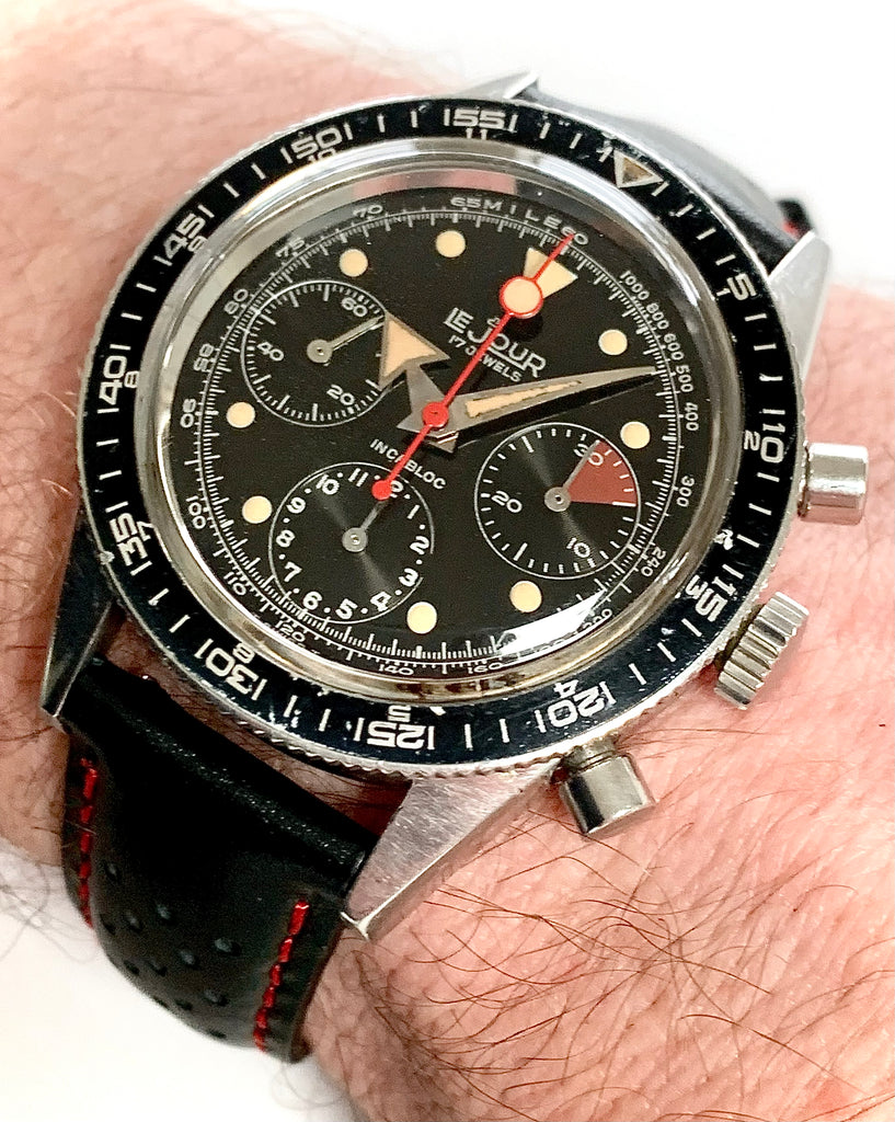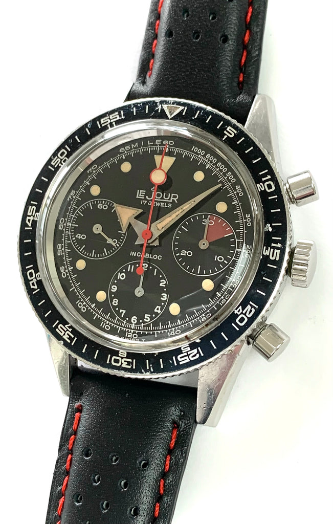 A gorgeous, high-quality early 1970's sporting chronograph by LeJour of Switzerland featuring a stunning factory printed black dial with beautifully aged tritium luminous matching the broad arrow style hands.  The case is solid stainless steel measuring 39mm in diameter and houses the famous Valjoux caliber 72 movement within, freshly serviced here at Meticulous and running beautifully with our full 1-year mechanical warranty.  Such a sharp looking sports watch on the wrist, this chronograph would have been the top-of-the-line LeJour offering back in its day and is still in superb, gently worn overall condition.  Famous for its association with Heuer in the 1970's, LeJour produced several models of the nearly the same design and quality, although it was originally a French based retailer that specialized in Swiss Made sports style watches, established in the 1960's. This example, powered by one of the highest quality chronograph movements ever designed and produced, the Valjoux calibre 72 was used by all of the top brands in its day including Rolex, Heuer, Universal, Breitling and Enicar.  It is a robust mechanism with incabloc balance protection with a beautiful sharp feel under the fingers.  Imported for sale in the US by J.P. Pingouin, this is a superb quality, beautifully designed and executed sports timepiece in excellent vintage condition, ready to wear!