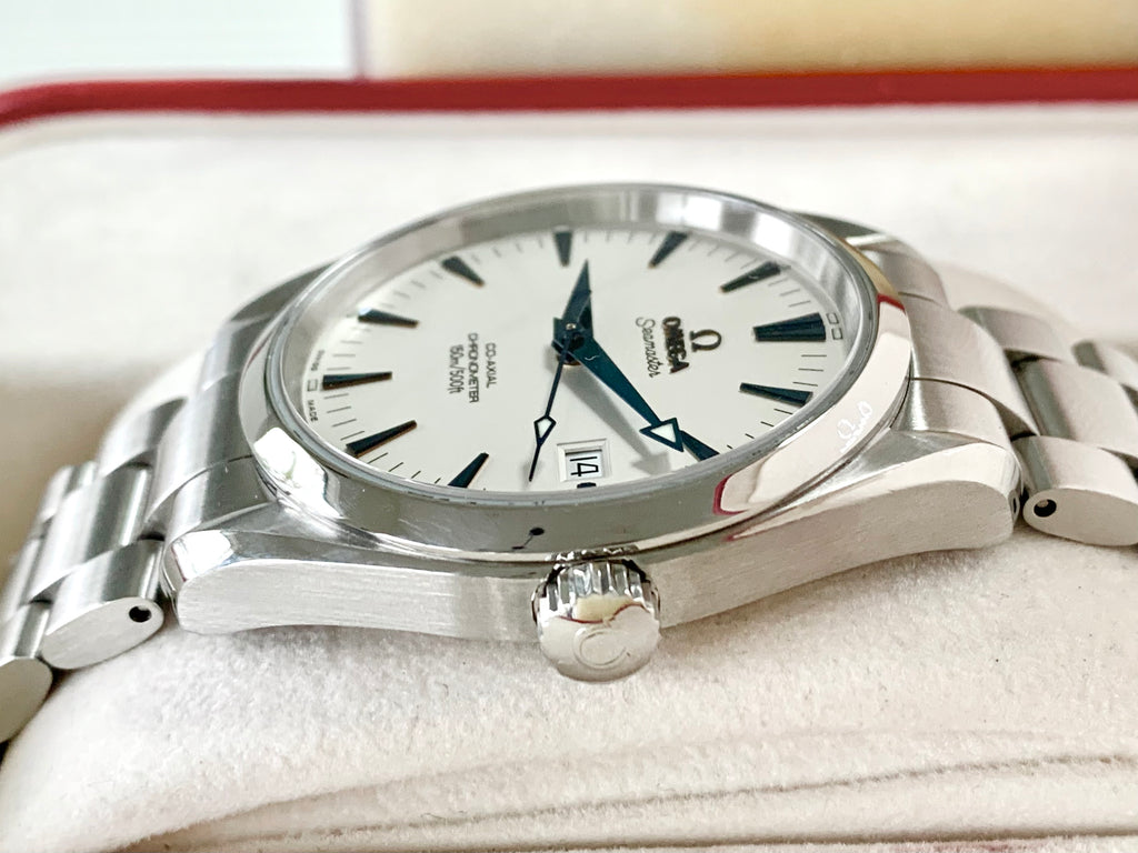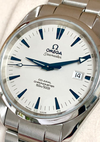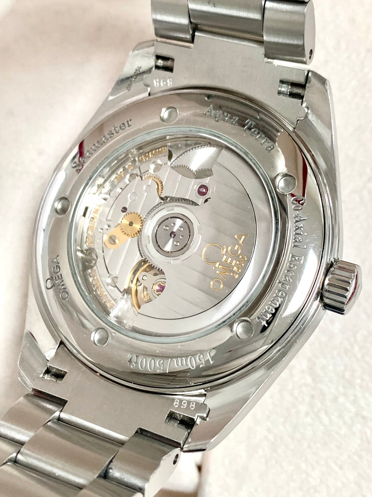 Case:  Solid stainless steel case measuring just over 39mm in diameter excluding the original signed screw-down crown with classic Bombay style lugs in beautiful lightly worn, brushed/polished condition.  The sapphire crystal is near mint and show the dial off beautifully, much like the movement on the reverse.  Signed on the back Omega Seamaster, Aqua Terra, Co-Axial Escapement, 150m/500Ft.  The original bracelet is also in excellent lightly used condition complete with all of its original links and will fit up to a 7-3/4 inch wrist. The watch tests fully water-resistant to 3 bar at the time of service.