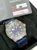 Case: Lightweight carbon composite case measuring 42mm in diameter with stainless steel back and bi-directional rotating bezel with ceramic insert and sapphire crystal. Superb, near mint condition. The original blue strap shows minor signs of wear, but is clean and comfortable on the wrist.