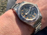 A wonderful 1968 Tudor Prince Oysterdate 200m/660ft Submariner with awesome an vintage feel featuring an original blue "blister" dial with snowflake style hands and gorgeous original ghost bezel on a solid stainless steel case with original Oyster style bracelet. This watch has such a cool look on the wrist, accented with the famous 7021 roulette red/black date display just to add that extra touch of colour to an already beautiful design. Freshly serviced and keeping excellent time this is a wonderful vintage dive watch from the famous house of Tudor/Rolex, ready to wear!